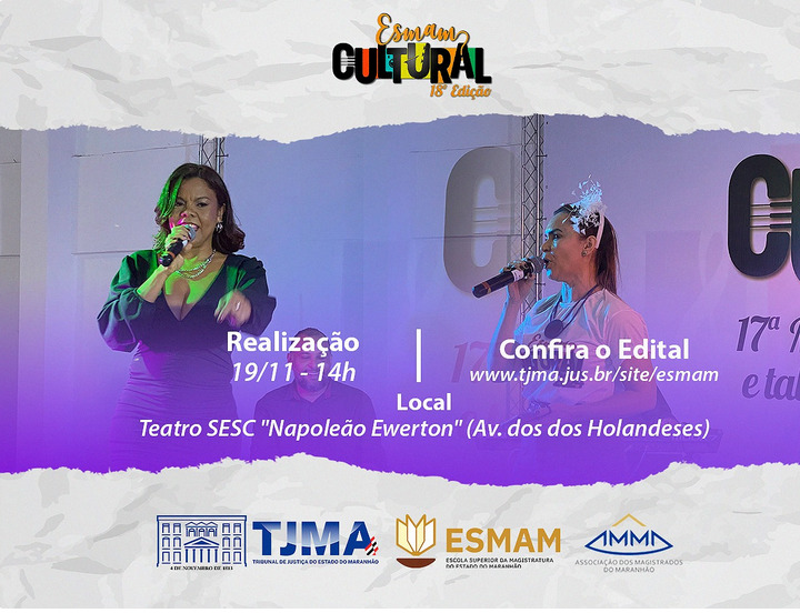 SÃO LUIS – A Escola Superior da Magistratura do Maranhão (ESMAM) realiza, no dia 19 de novembro, a 18ª edição da Mostra de Arte e Cultura do Judiciário do Maranhão, no Teatro SESC “Napoleão Ewerton”, em São Luís. O evento, já tradicional no calendário cultural da capital, integra as comemorações pelo 39º aniversário da instituição e reúne 35 trabalhos artísticos produzidos por magistrados, magistradas e servidores do Tribunal de Justiça do Maranhão (TJMA).
