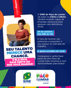 PAÇO DO LUMIAR – A Prefeitura de Paço do Lumiar, por meio da Secretaria Municipal de Desenvolvimento Social (SEMDES), realizou nesta sexta-feira (24) uma ação de inclusão produtiva voltada exclusivamente para pessoas com deficiência (PcD), com oferta de vagas de emprego no CRAS e CREAS do bairro Tambaú. A iniciativa acontece das 8h às 12h, em parceria com o SINE Paço.