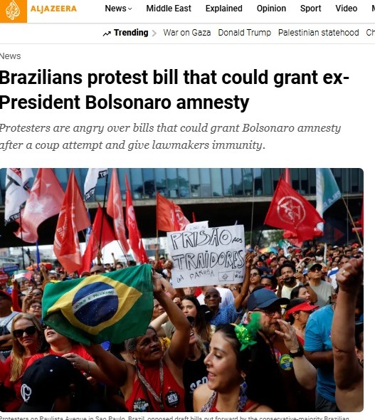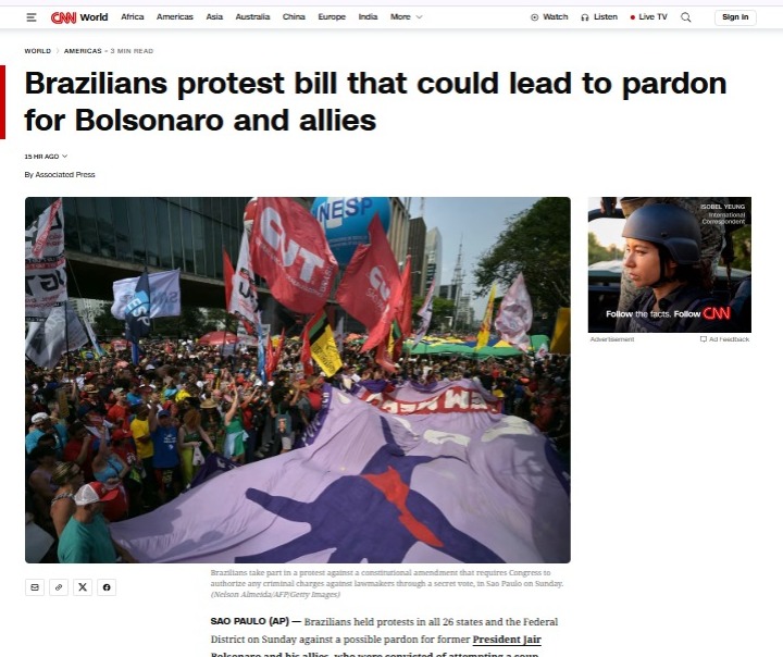 Veículos estrangeiros ressaltaram o caráter massivo dos atos, a rejeição popular à impunidade e a pressão sobre um Congresso de maioria conservadora que busca blindar a si mesmo e reabilitar o ex-presidente Jair Bolsonaro, condenado a 27 anos de prisão por tentativa de golpe.