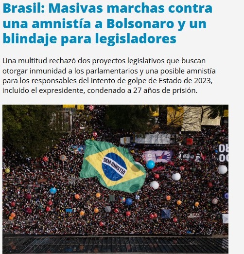 Na Argentina, o diário Página 12 frisou que o lema central dos atos foi “Sem anistia” e que os protestos foram motivados pela “sentença histórica contra Bolsonaro”.