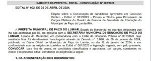 PAÇO DO LUMIAR – A prefeitura de Paço do Lumiar, na gestão da prefeita Paula Azevedo (PCdoB), divulgou nesta sexta-feira (05) a segunda convocação dos candidatos aprovados no Concurso Público regido pelo Edital n° 001/2023 da Secretaria Municipal de Educação (SEMED).