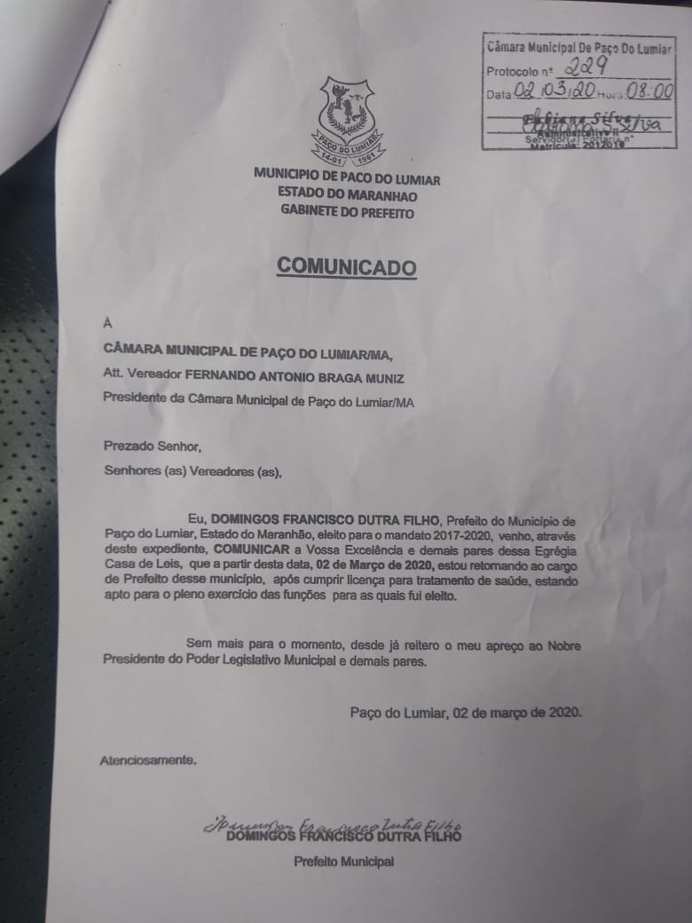 GRANDE ILHA – Depois de passar sete meses licenciado do cargo por motivo de saúde, o prefeito de Paço do Lumiar, Domingos Dutra, retornou ao cargo na manhã desta segunda-feira, (02).