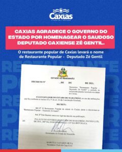 “O Restaurante Popular da cidade de Caxias passa a denomina-se “Restaurante Popular – Deputado Zé Gentil”, diz o Artigo 1° do decreto assinado pelo governador Flávio Dino.
